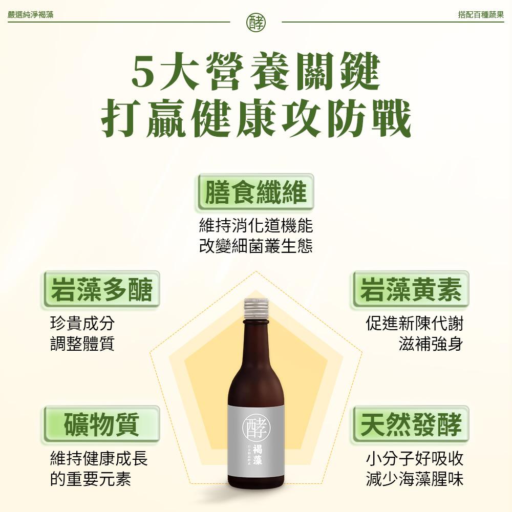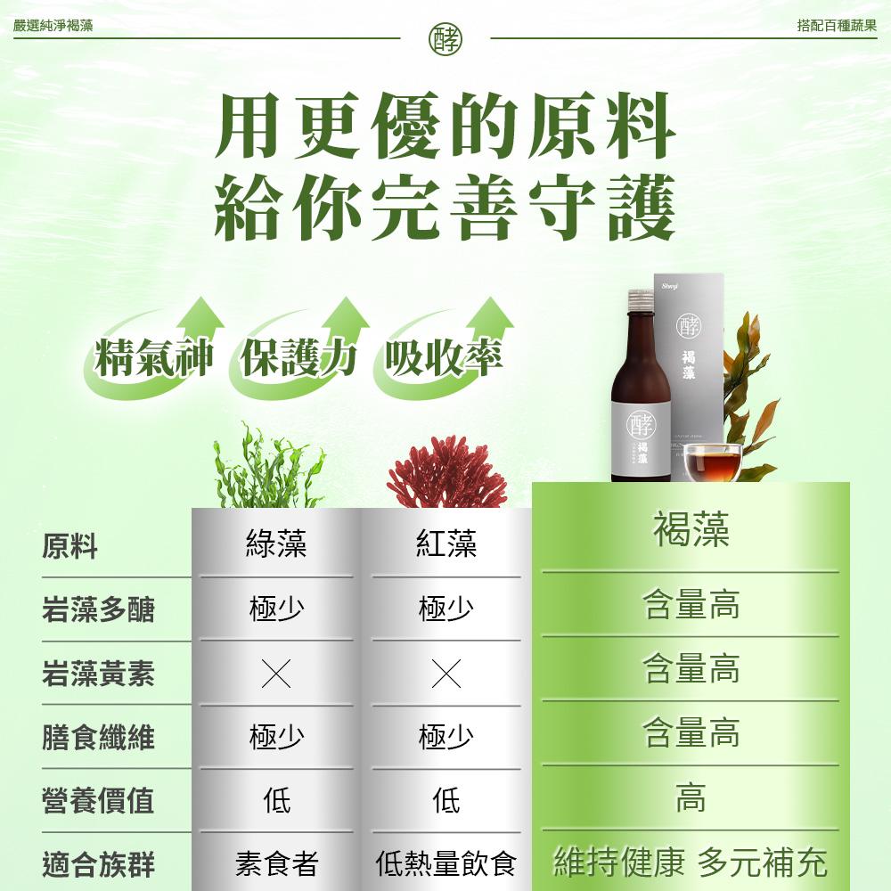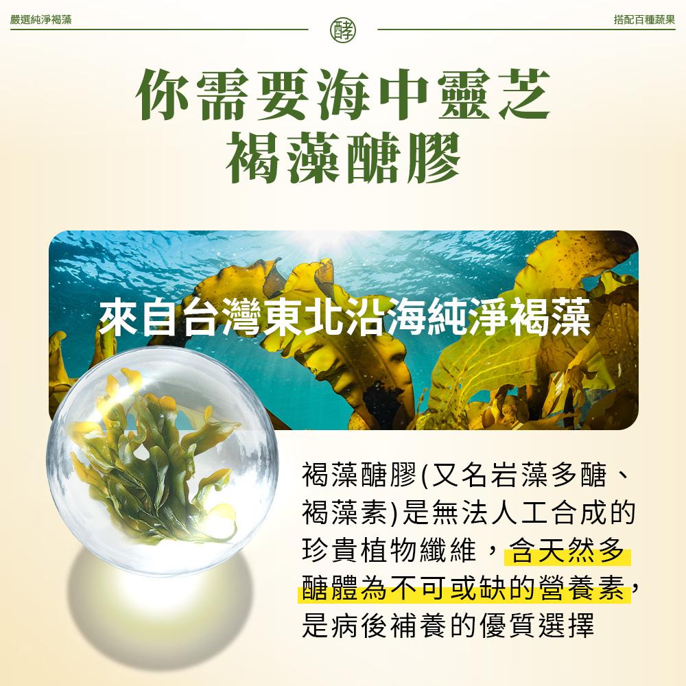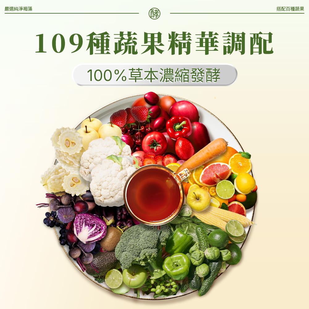 內容物名稱(成分):褐藻萃取液、液態發酵靈芝菌絲體(ganoderma lucidum(Leyss:Fr.)Karst)、黃精、紅藻、珊瑚草、高麗菜、空心菜、長年菜、小白菜、花椰菜、芥藍菜、紅鳳菜、青江菜、皇宮菜、青花菜、蕃薯葉、白蘿蔔、紅蘿蔔、馬鈴薯、苜蓿芽、綠豆芽、紅豆芽、黑豆芽、黃豆芽、花生芽、豌豆苗、大黃瓜、小黃瓜、西洋芹、竹筍、蕃薯、薑、甜椒、青椒、山蘇、茄子、A菜、莧菜、毛豆、芹菜、菠菜、白菜、油菜、茼蒿、冬瓜、南瓜、胡瓜、苦瓜、絲瓜、蘆筍、玉米、牛蒡、萵苣、昆布、川七、紫菜、海帶、木耳、美濃瓜、葡萄柚、哈密瓜、奇異果、火龍果、百香果、檸檬、梨子、鳳梨、木瓜、龍眼、荔枝、香蕉、洋香瓜、蘋果、草莓、西瓜、蕃茄、梅子、桑葚、李子、酪梨、椰子、芭樂、甘蔗、柳丁、橘子、甜桃、葡萄、當歸、百合、黃耆、人參根、山藥、枸杞、茵陳、仙楂、紅棗、黑棗、甘草、茯苓、秀珍菇、金針菇、珊瑚菇、杏鮑菇、美白菇、猴頭菇、洋菇、香菇、糖。