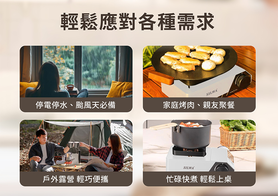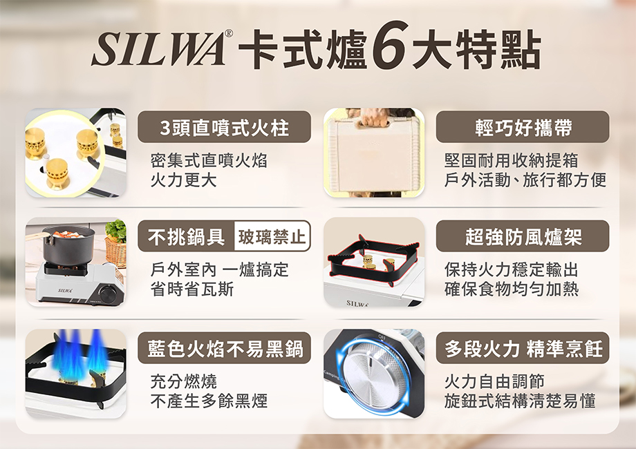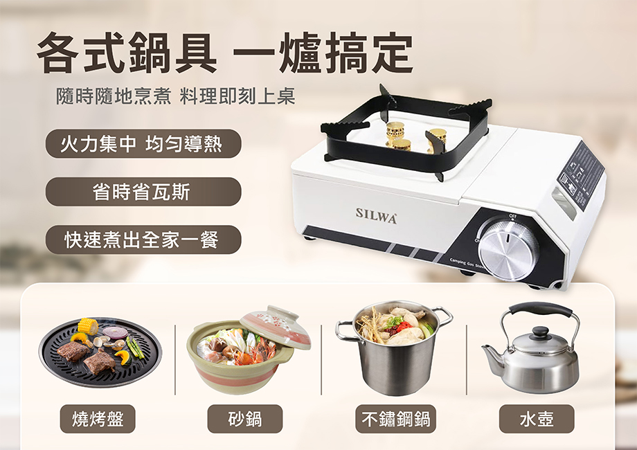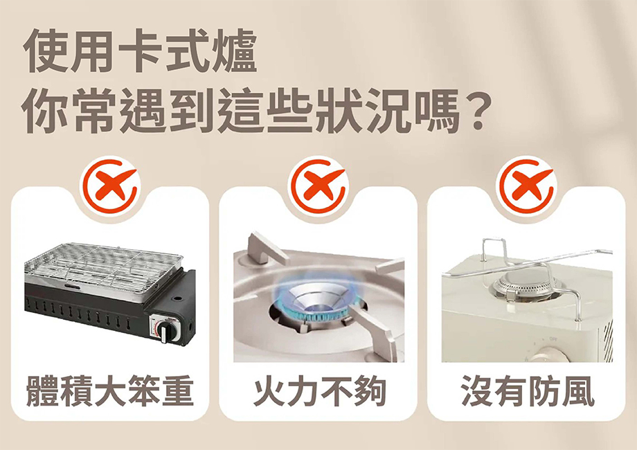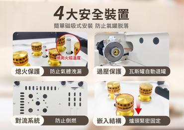 操作方式:裝上瓦斯罐後確認無漏氣,旋轉開關旋鈕點燃。使用必須確認點火、著火、熄火動作。