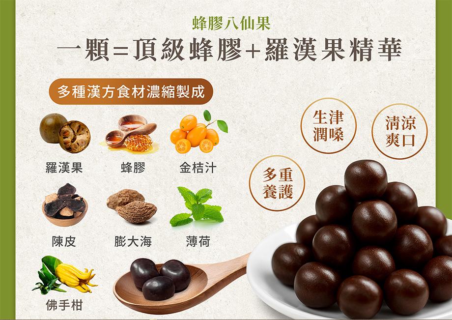 成分:砂糖、麥芽糖、椰子油、明膠、金桔、陳皮、羅漢果、膨大海、蜂蜜、薄荷、香料、食用色素(焦糖色素)、蜂膠、棕櫚臘。