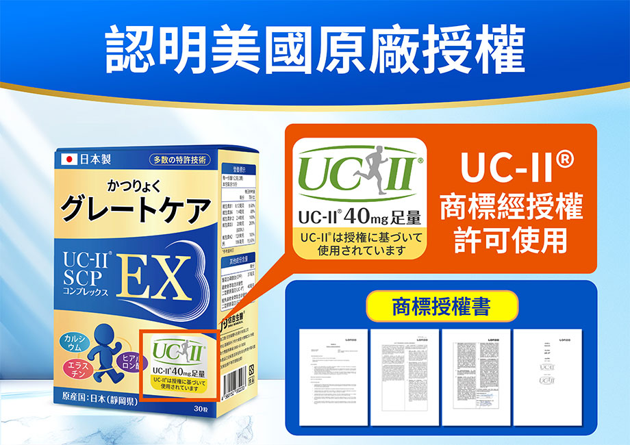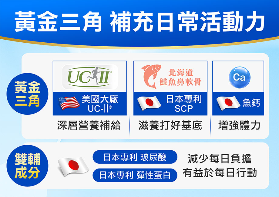 碳酸鈣、微結晶狀纖維素、膠原蛋白、維生素K2(阿拉伯膠、檸檬油、L-抗壞血酸鈣、維生素K2、混合濃縮生育醇)、維軟骨抽出物(含非變性二型膠原蛋白UCII)、酪蛋白磷酸胜肽、鮭魚鼻軟骨萃取(含非變性二型膠原蛋白SCP)、雞冠萃取物、磷酸鈣、硬脂酸鎂、維生素D3(阿拉伯膠、蔗糖、玉米澱粉、中鏈三酸甘油酯、維生素D3、維生素E(抗氧化劑))、維生素B12(玉米澱粉、檸檬酸鈉、檸檬酸、羥丙基甲基纖維素)、維生素B6、維生素B1