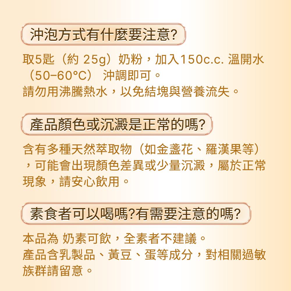 【其他添加】-膳食纖維、大豆卵磷脂、菊糖、鉻酵母、綜合酵素、鉻蛋白磷酸胜肽、硒酵母、高山披孢黴發酵產物、冠氏隱甲藻萃取 物、葡萄籽萃取物、牛磺酸、金盞花萃取物、羅漢果萃取物、磷脂醯絲胺酸、乳酸菌