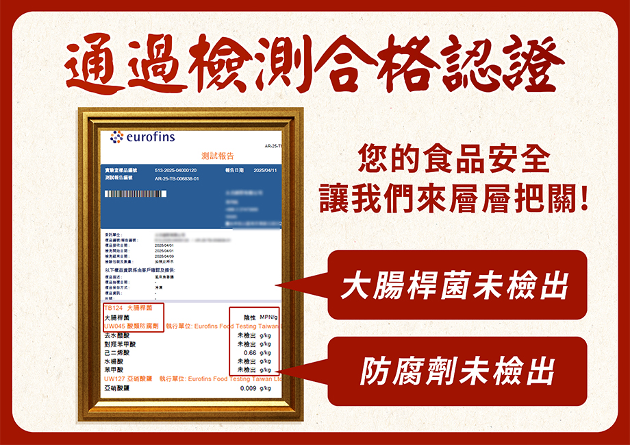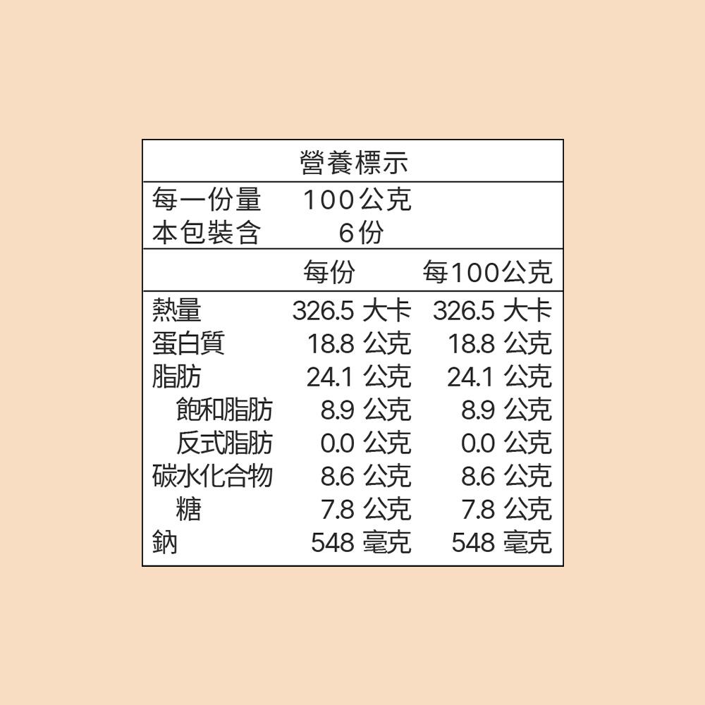 食品添加物:調味劑(L-麩酸鈉、琥珀酸二鈉、5’-次黃嘌呤核苷磷酸二鈉、5’-鳥嘌呤核苷磷酸二鈉)、抗氧化劑(異抗壞血酸鈉)、多磷酸鈉、亞硝酸鈉(保色劑)、著色劑(紅麴色素)、調味劑(DL-胺基丙酸、甘草萃)、香料