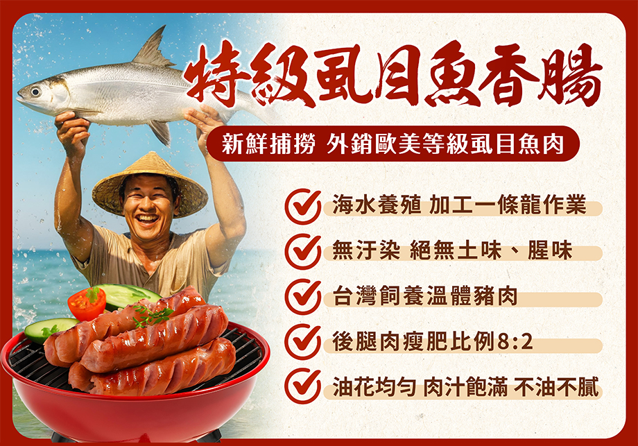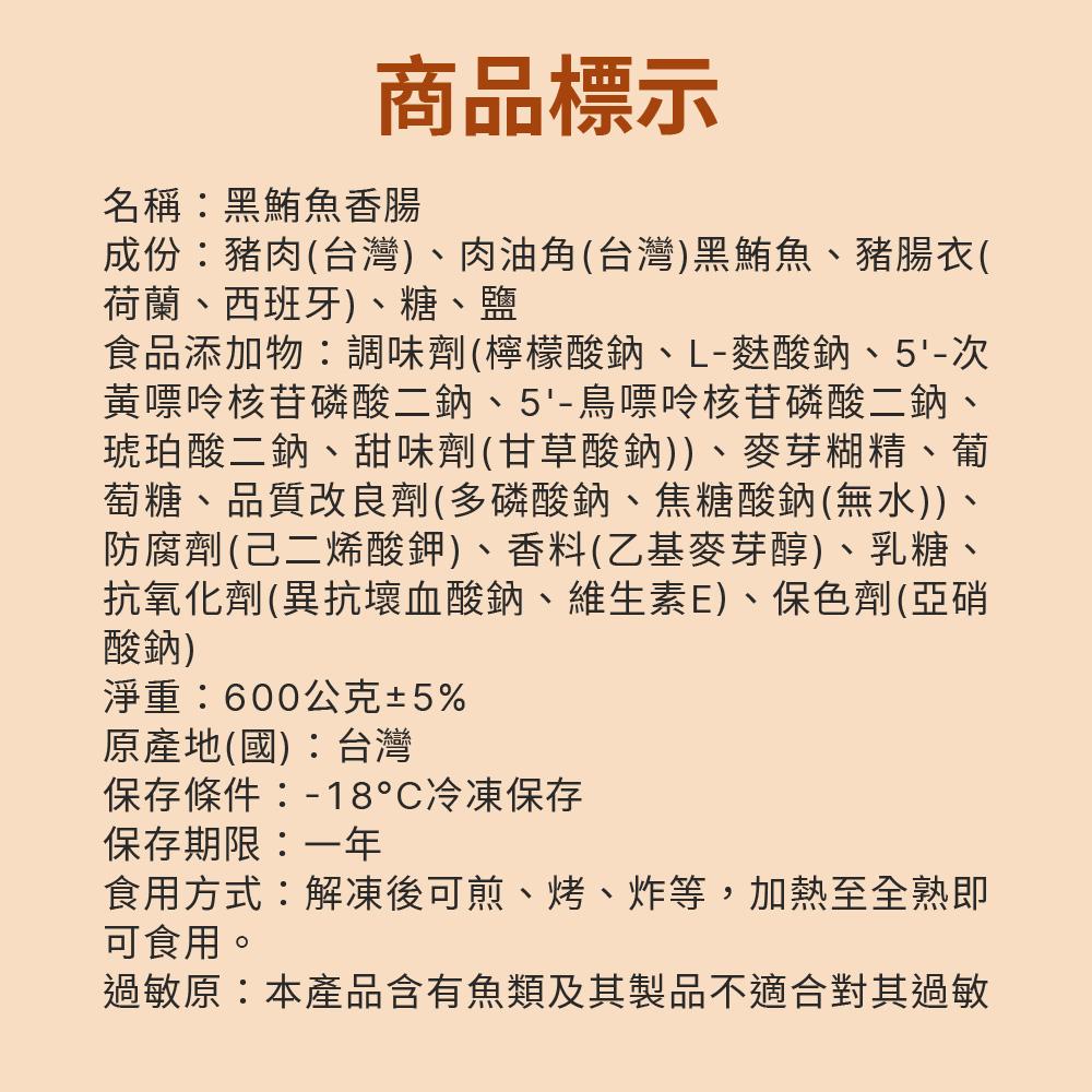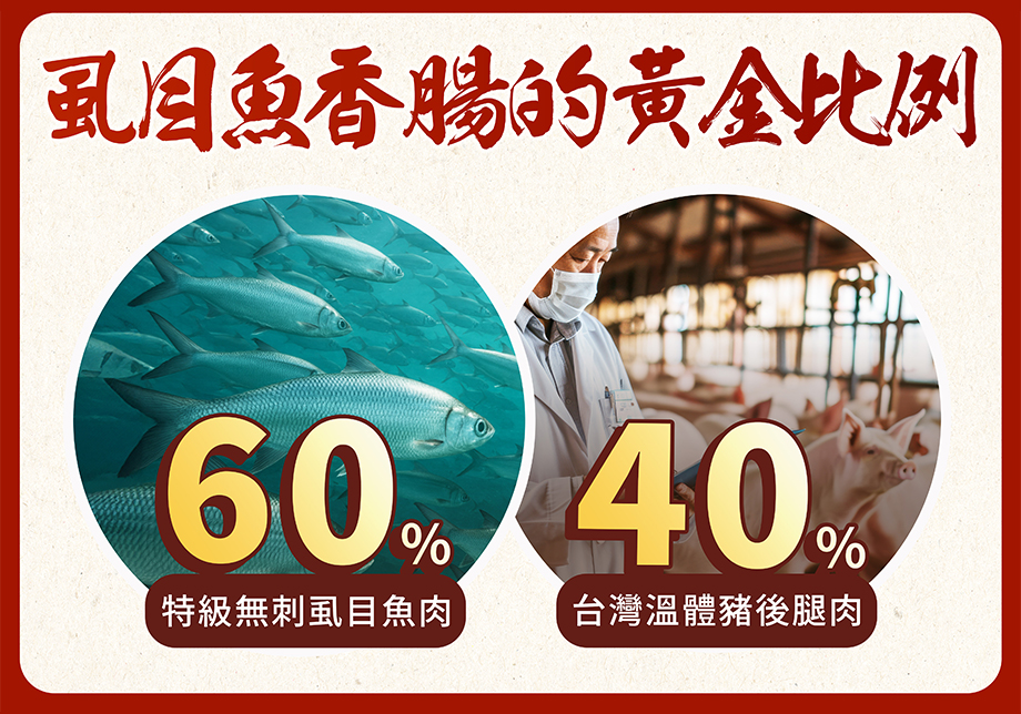 成份:豬肉(台灣)、內臟油(台灣)、魚肉、飛魚卵、豬腸衣(豬腸、西班牙)