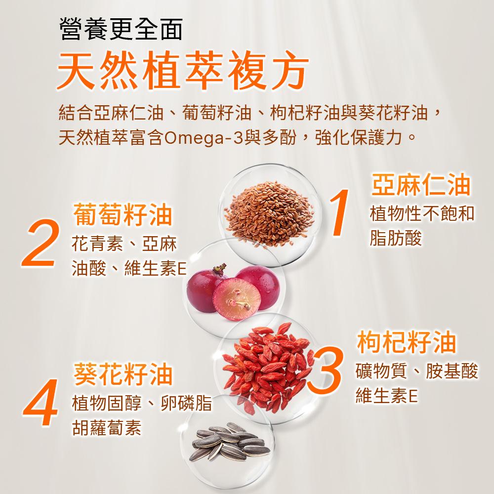 1. 成分:亞麻仁油、葡萄籽油、金盞花萃取物【葵花籽油、金盞花萃取物(含葉黃素、玉米黃素)】、枸杞種籽油。