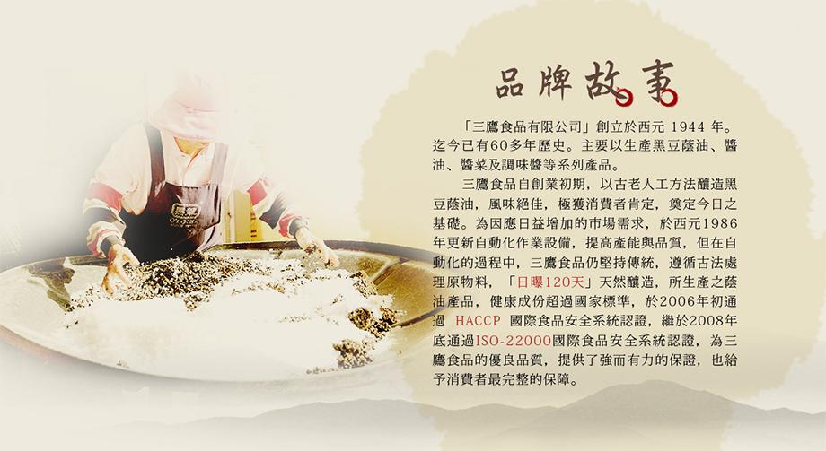創於西元1944年,迄今已有六十多年歷史,創業初期以古老人工方法釀造黑豆蔭油,