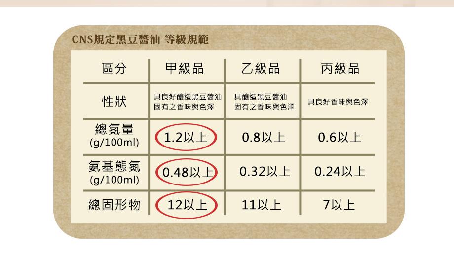 ●純釀造標章+符合國家標準CNS423甲級醬油