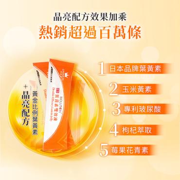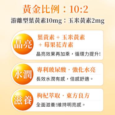成份:水、柳橙原汁、果糖粉、金盞花萃取物(含游離型葉黃素)、枸杞萃取粉(含玉米黃素)、藍莓粉、接骨木莓萃取粉、玉米糖膠、刺瑰豆膠、海藻酸鈉、乳酸鈣、維生素C、柳橙香料、流行鏈球菌發酵物(含玻尿酸/透明質酸鈉)。