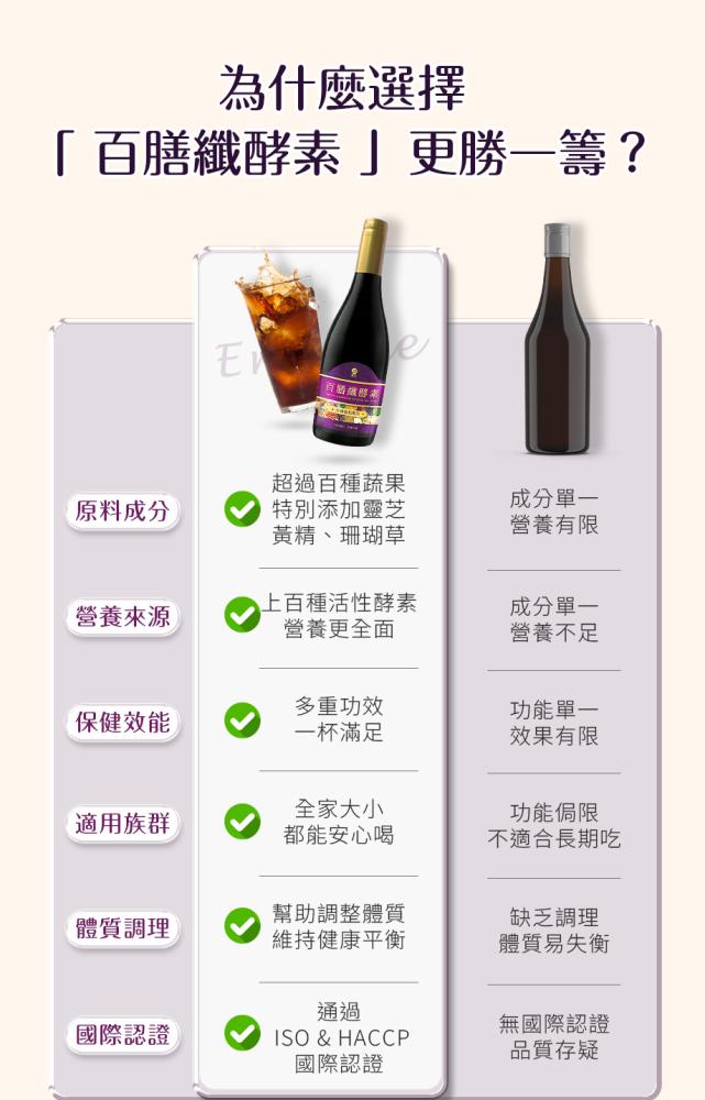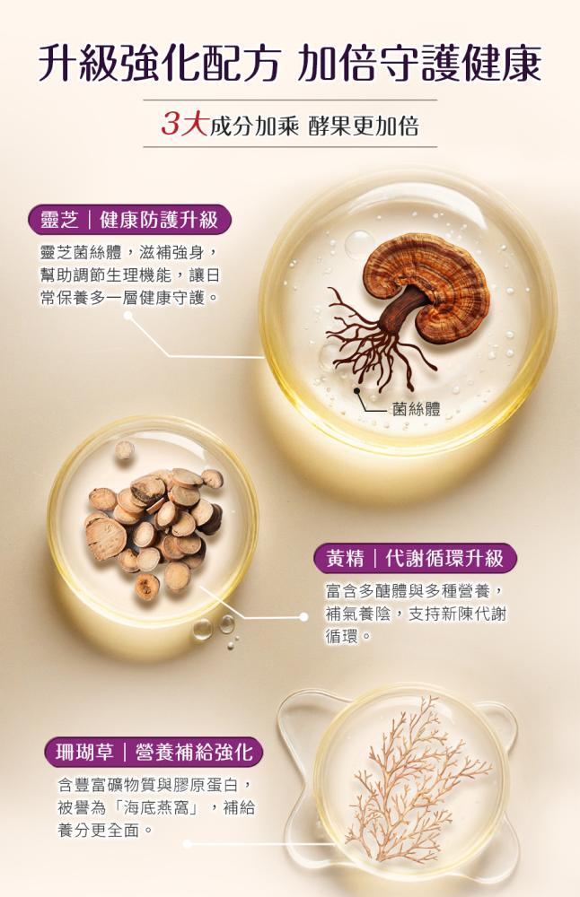原料:靈芝菌絲體、黃精、紅藻、珊瑚草、高麗菜、空心菜、長年菜、小白菜、花椰菜、芥藍菜、紅鳳菜、青江菜、皇宮菜、青花菜、妹仔菜、蕃薯葉、白蘿蔔、紅蘿蔔、馬鈴薯、苜宿芽、綠豆芽、紅豆芽、黑豆芽、黃豆芽、花生芽、豌豆苗、大黃瓜、小黃瓜、西洋芹、牧草、竹筍、蕃薯、薑、甜椒、青椒、山蘇、茄子、A菜、莧菜、毛豆、芹菜、菠菜、白菜、油菜、茼蒿、冬瓜、南瓜、胡瓜、苦瓜、絲瓜、蘆筍、玉米、牛蒡、萵苣、昆布、川七、紫菜、海帶、木耳、美濃瓜、葡萄柚、哈蜜瓜、奇異果、無花果、百香果、檸檬、梨子、鳳梨、木瓜、龍眼、荔枝、香蕉、香瓜、蘋果、草莓、西瓜、蕃茄、梅子、桑椹、李子、酪梨、椰子、芭樂、甘蔗、柳丁、橘子、甜桃、葡萄、當歸片、百合、黃耆片、高麗鬚、山藥、枸杞、茵陳、仙楂、紅棗、黑棗、甘草、茯苓、秀珍菇、金針菇、珊瑚菇、杏鮑菇、美白菇、猴頭菇、洋菇、香菇、糖。