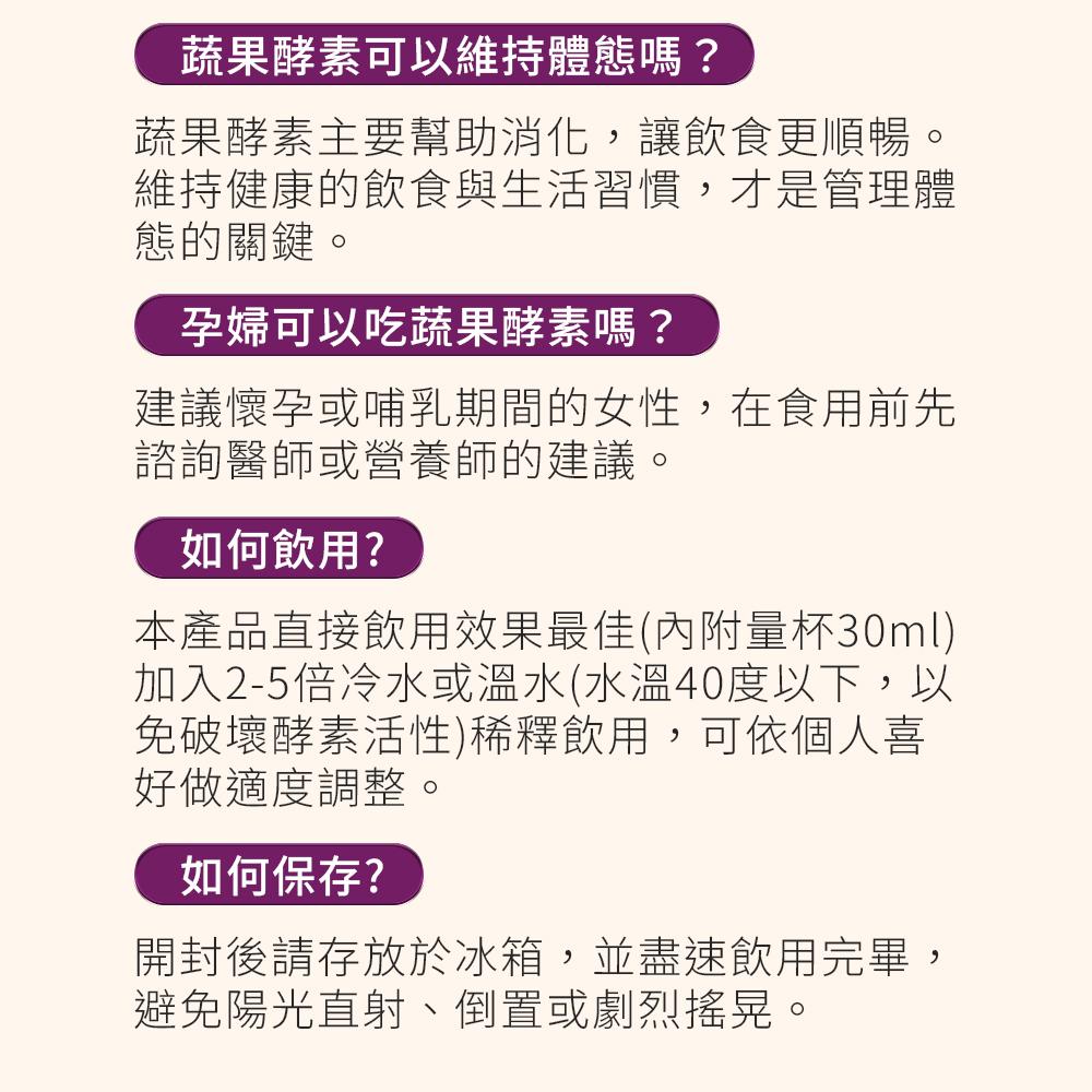飲用方法:本產品直接飲用效果最佳(內附量杯30ml)加入2-5倍冷水或溫水(溫水40°C以下,以免破壞酵素活性)稀釋飲用,可依個人喜好做適度調整。