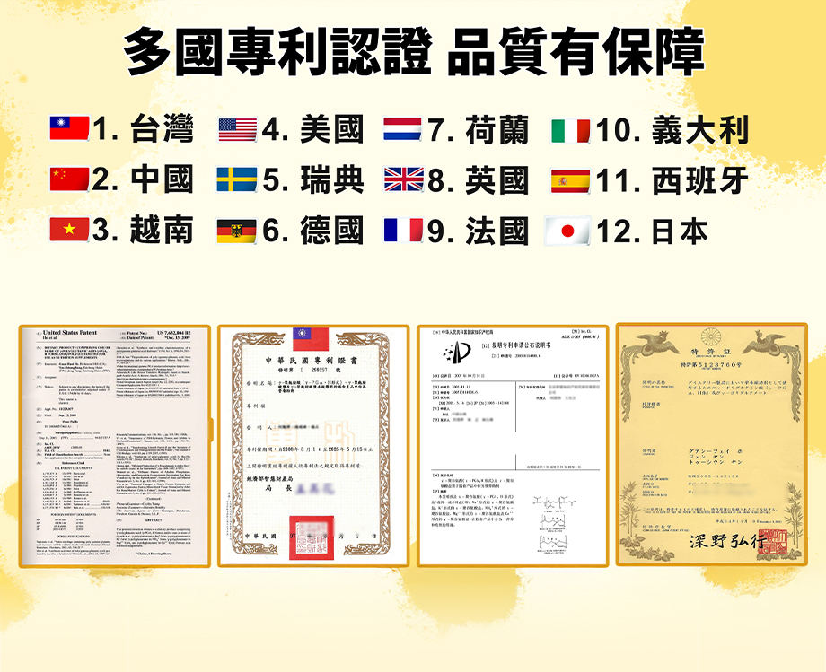 成份:甲基硫醯基甲烷(MSM)、納豆膠、貓爪藤萃取物、鴕鳥骨萃取物、鴕鳥筋萃取物、鴕鳥肉萃取物、 全龜萃取物、鹿角萃取物、黃精、刺五加、茯苓、杜仲葉萃取物、黨参、西洋参、黃耆、甘草、川芎、黑棗、枸杞、桂枝、肉桂