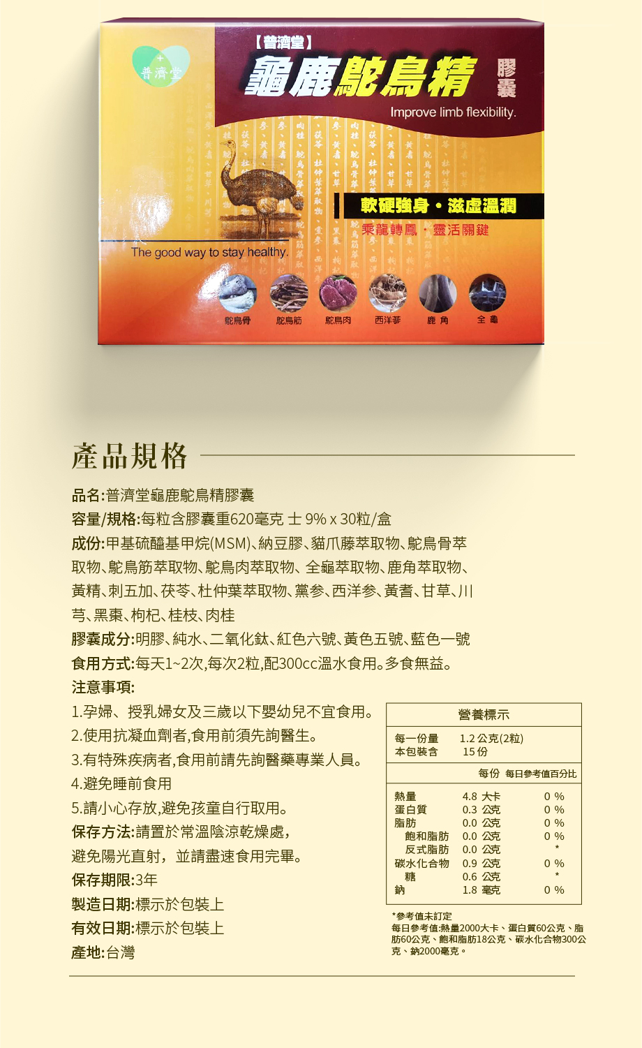 品名:普濟堂龜鹿鴕鳥精膠囊