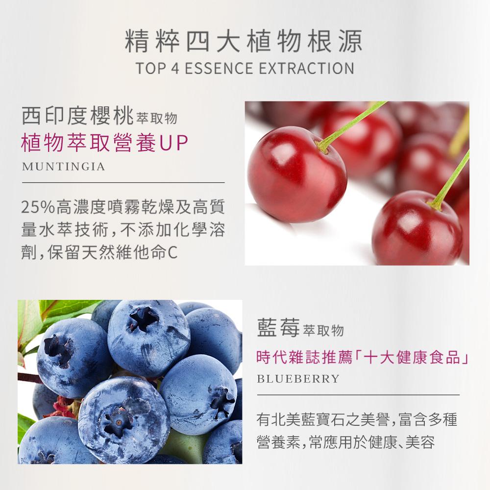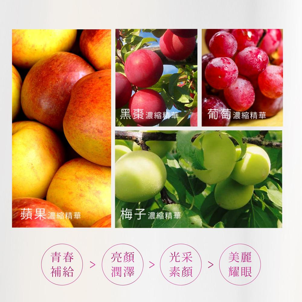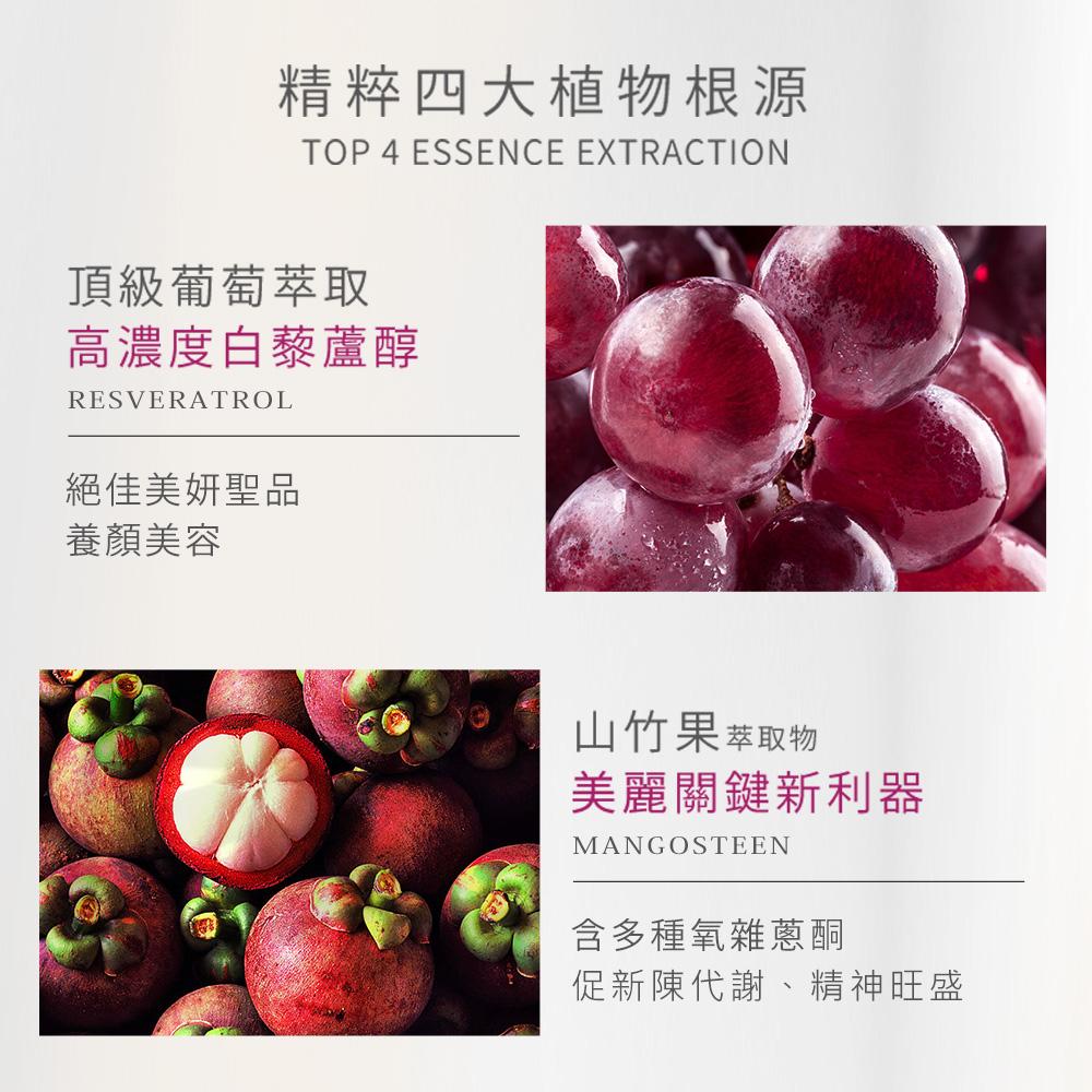 內容物名稱(成分):水、異麥芽寡糖、葡萄濃縮汁、葡萄皮萃取物(含白藜蘆醇)、梅子濃縮汁、蘋果濃縮汁、鹿角菜膠、玉米來源可溶性纖維、黑棗濃縮汁、刺槐豆膠、寒天粉(洋菜)、檸檬酸鉀、檸檬酸鈉、無水檸檬酸、紅葡萄萃取物(含白藜蘆醇)、西印度櫻桃萃取粉、藍莓萃取物、山竹萃取物。