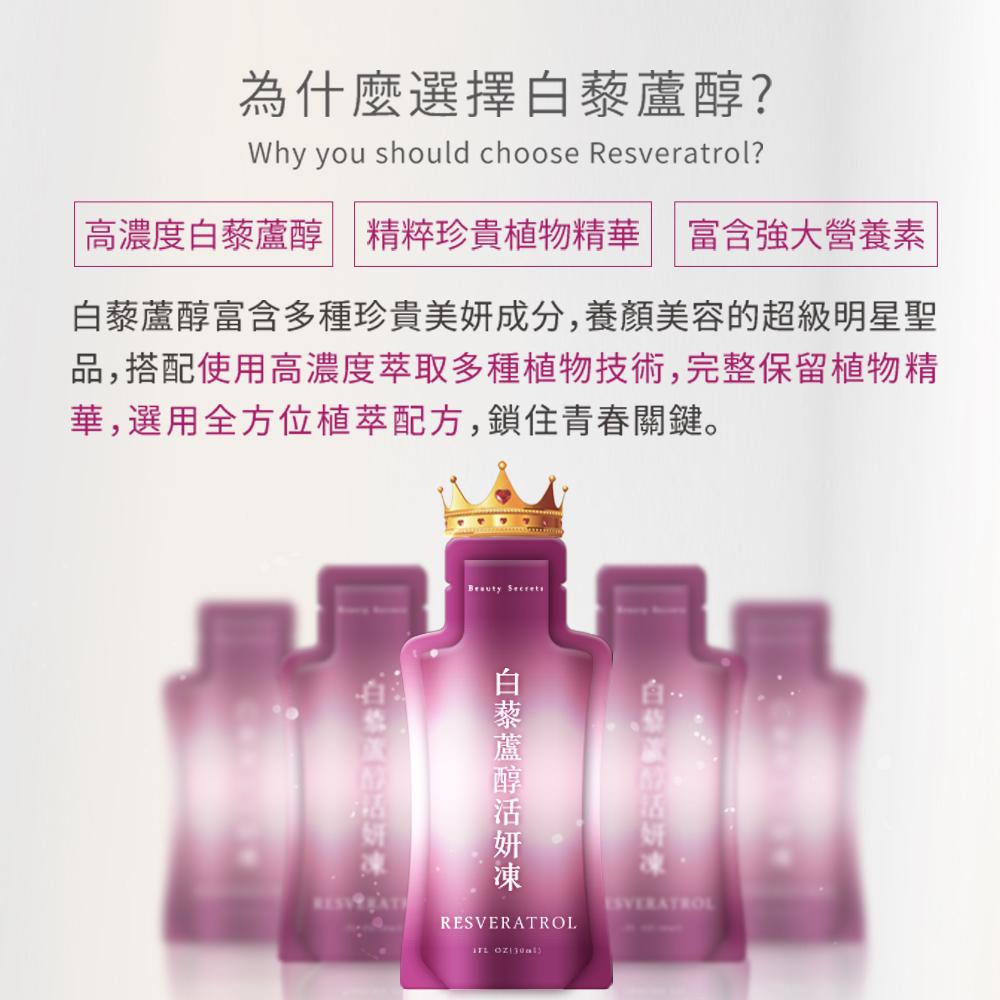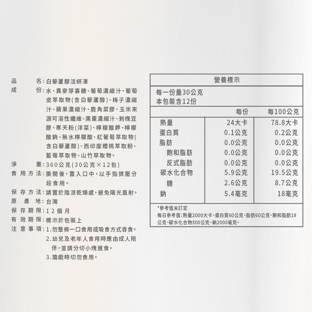 內 容 物:水、異麥芽寡糖、葡萄濃縮汁、葡萄皮萃取物(含白藜蘆醇)、梅子濃縮汁、蘋果濃縮汁、鹿角菜膠、玉米來源可溶性纖維、黑棗濃縮汁、刺槐豆膠、寒天粉(洋菜)、檸檬酸鉀、檸檬酸鈉、無水檸檬酸、紅葡萄萃取物(含白藜蘆醇)、西印度櫻桃萃取粉、藍莓萃取物、山竹萃取物。