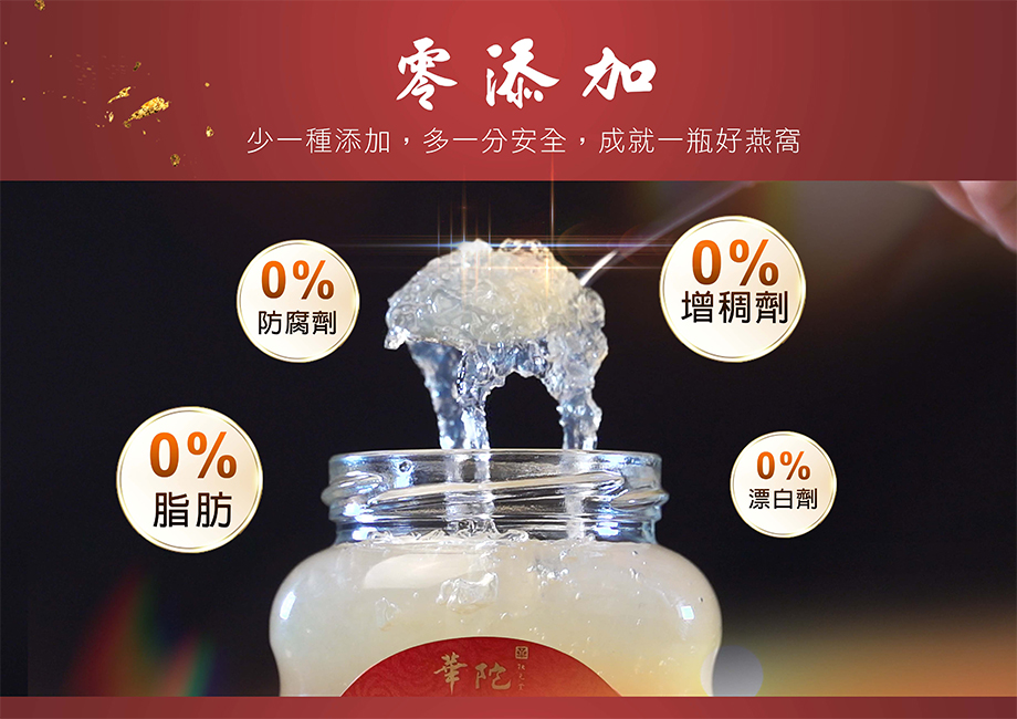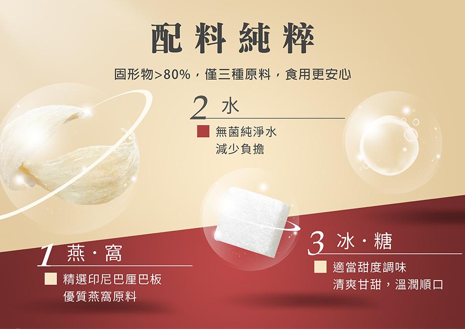 即食燕窩採純正燕窩熬煮而成,並經過高溫消毒殺菌,過程中無添加任何化學藥劑,