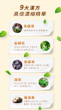 成份:加州濃縮西梅汁(黑棗濃縮汁)、療肺草精萃(麥芽糖、療肺草萃取物(療肺草萃取物、麥芽糊精))、烏梅萃取液、蜂蜜、枇杷葉萃取液、魚腥草萃取液、羅漢果萃取液、桔梗萃取液、金銀花萃取液、珍珠粉、紫蘇葉萃取物(紫蘇葉萃取物、麥芽糊精)、綠蜂膠萃取物、薄荷