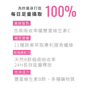麥芽糊精)、柑橘萃取物、玉米來源可溶性纖維、甘氨酸亞鐵(甘氨酸亞鐵、檸檬酸、麥芽糊精、二氧化矽)、綜合蔬果粉(含維生素來自菠菜、花椰菜、胡蘿蔔、甜菜、番茄、香菇、蘋果、蔓越莓、橘子、藍莓、草莓)。