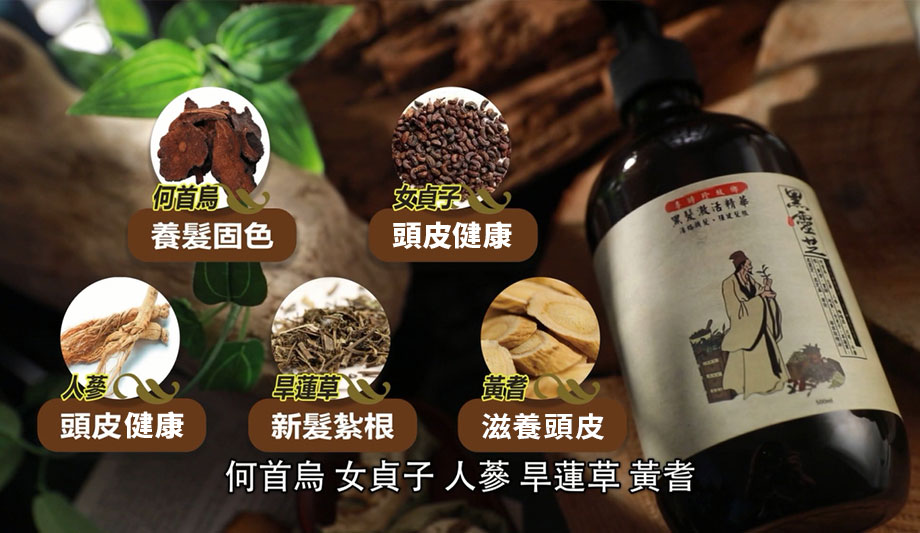 成分:何首烏萃取精油、生姜萃取精油、人參萃取精油、咖啡因、川芎萃取精油、牛蒡根萃取精油、黃耆萃取精油、當歸萃取精油、地黃萃取精油、女貞子萃取精油、旱蓮草萃取精油、黑靈芝萃取精油、黑芝麻萃取精油、薄荷萃取精油、Silverfree、Greyverse Patent詳見盒身標示