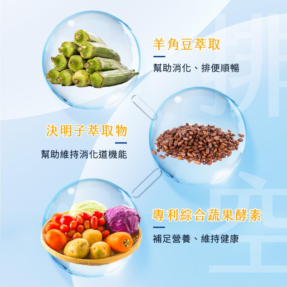 內容物名稱(成分):水、綜合莓濃縮汁(蘋果、蔓越莓、草莓、覆盆莓、櫻桃、黑醋栗、醋栗)、蘋果濃縮汁、乳糖醇、藍莓濃縮果汁、蒟蒻果凍粉(檸檬酸鉀、鹿角菜膠、蒟蒻粉、葡萄糖、檸檬酸鈉、羧甲基纖維素鈉、塔拉膠、果膠)、羊角豆萃取物 (羊角豆萃取物、麥芽糊精)、蒟蒻粉、玉米來源可溶性纖維、決明子萃取物(決明子萃取物、麥芽糊精)、綜合蔬果酵素粉(玉米來源可溶性膳食纖維、諾麗果、水蜜桃、荔枝、紅葡萄柚、紅葡萄、蘋果、石榴、番茄、柳橙、蔓越莓、草莓、覆盆莓、櫻桃、黑醋栗、醋栗、白葡萄、胡蘿蔔、百香果、鳳梨、檸檬、綠花椰菜、芹菜、蘆筍、藍莓、楊梅、桑椹)、檸檬酸、醋磺內酯鉀(甜味劑)、藤黃果抽出物、紅藜麥粉、蘋果果膠、乳酸菌(麥芽糊精、乳酸菌、糖)、黑胡椒萃取物。