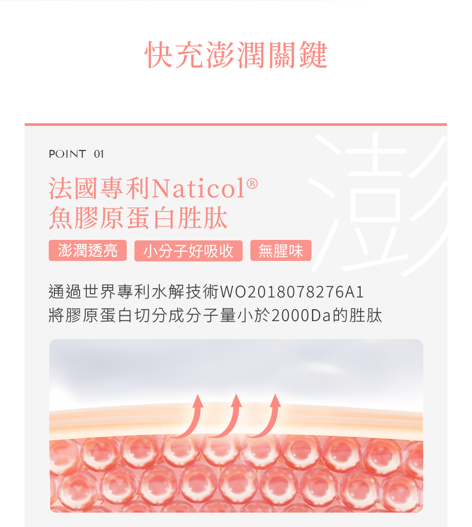 成份:魚膠原蛋白胜肽、穀胱甘肽、余甘子萃取物(余甘子萃取物、麥芽糊精、氯化鈉、二氧化矽)、玫瑰花瓣萃取物、越桔萃取物(越桔萃取物(含熊果素)、麥芽糊精)、牛乳磷脂質(含神經醯胺/賽洛美)