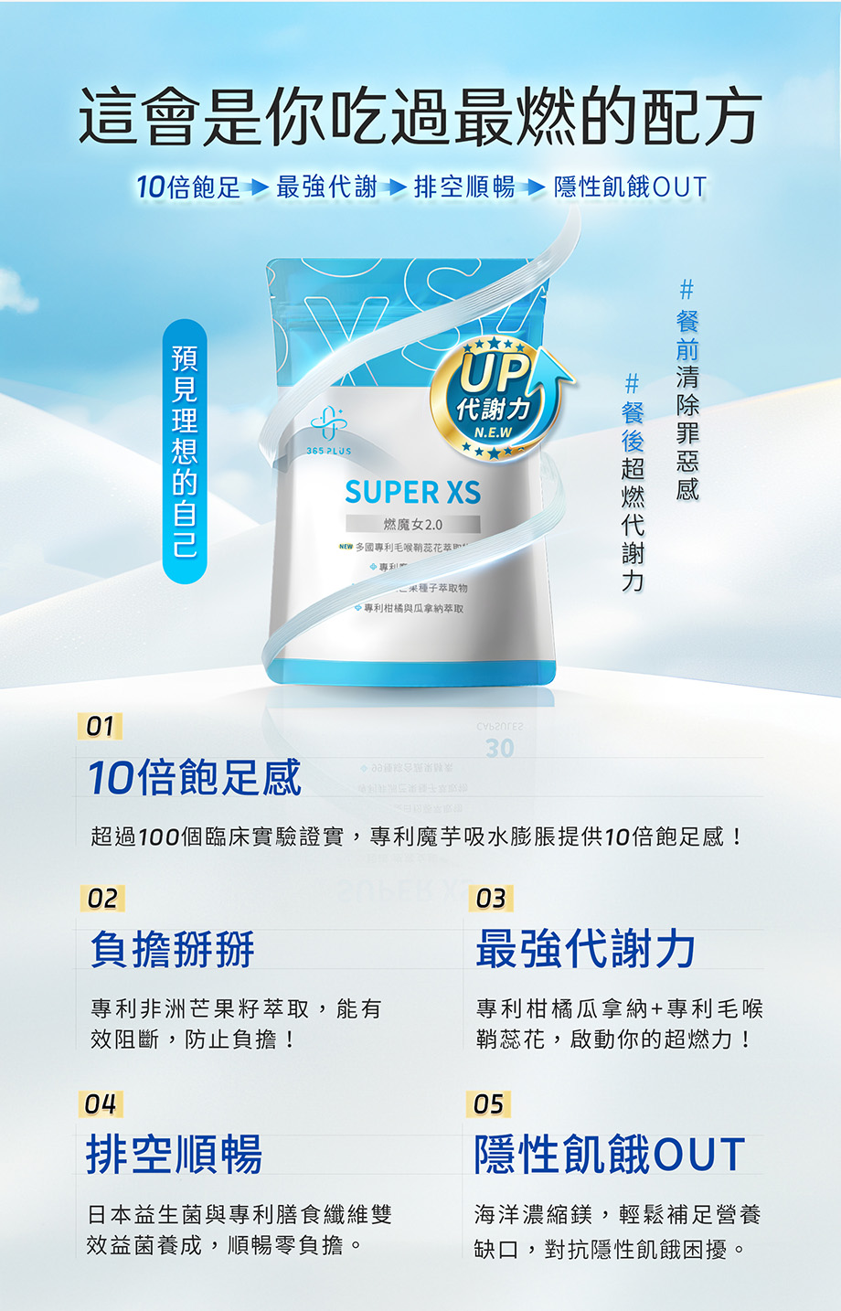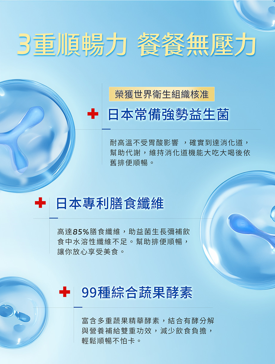 成份: :海水濃縮物、非洲芒果種子萃取物、綜合蔬果發酵粉(決明子萃取物、糊精、昆布、裙帶菜、紫菜、香菇、檸檬馬鞭草、苦艾、西番蓮、金盞草、大飛揚草、牛筋草、檸檬草、大茴香、馬黛茶、魚腥草、紫蘇、薰衣草、貓薄荷、洋甘菊、生薑、益母草、番石榴葉、丁香、咸豐草、迷迭香、燕麥片、玉米、大麥、豌豆、紅豆、薏苡仁、芝麻、刺槐豆、小米、大豆、爆裂玉米、黑麥、黑豆、鷹嘴豆、扁豆、糙米、鳳梨、香蕉、蘋果、木瓜、番石榴、甜瓜、酪梨、梅子、西印度櫻桃、檸檬、葡萄乾、芒果、楊桃、西瓜、腰果、核桃、奇異果、梨子、巴西莓、卡姆果、萊姆、玫瑰果、橘子、樹莓、柳橙、水蜜桃、紅蘿蔔、甘藍、蓮藕、牛蒡、菊苣、地瓜、南瓜、木薯、番茄、羽衣甘藍、青椒、紅甜菜、胡蘿蔔、長型南瓜)、酪酸菌(麥芽糊精、酪酸菌)、玉米來源可溶性纖維、二氧化矽、硬脂酸鎂、滑石粉、綜合消化酵素(澱粉酵素、葡萄糖澱粉酵素、植物酵素(含脂肪分解酵素、蛋白質分解酵素、澱粉酵素)、植酸酵素、果膠酵素、脂肪分解酵素、蛋白質酵素、轉化酵素、蛋白分解酵素4.5、鳳梨酵素、β-葡聚醣酵素、纖維分解酵素、蛋白分解酵素3.0、半纖維素分解酵素、木聚醣酵素、乳糖酵素、木瓜酵素、胜肽酵素、蛋白分解酵素6.0、澱粉糖化酵素、麥芽糊精)、複合式柑橘及瓜拿納萃取物(複合式柑橘(葡萄柚萃取物、甜橙萃取物、血橙萃取物)、麥芽糊精、瓜拿納萃取物)、魔芋萃取物、毛喉鞘蕊花萃取物(毛喉鞘蕊花萃取物、麥芽糊精)