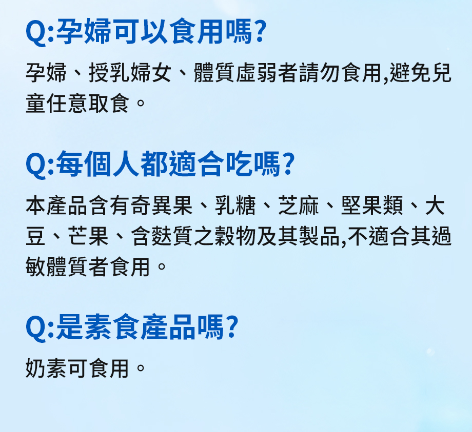 5.本產品含有乳糖、奇異果、芝麻、堅果類、大豆、芒果、含麩質之穀物及其製品,不適合其過敏體質者食用。